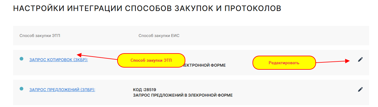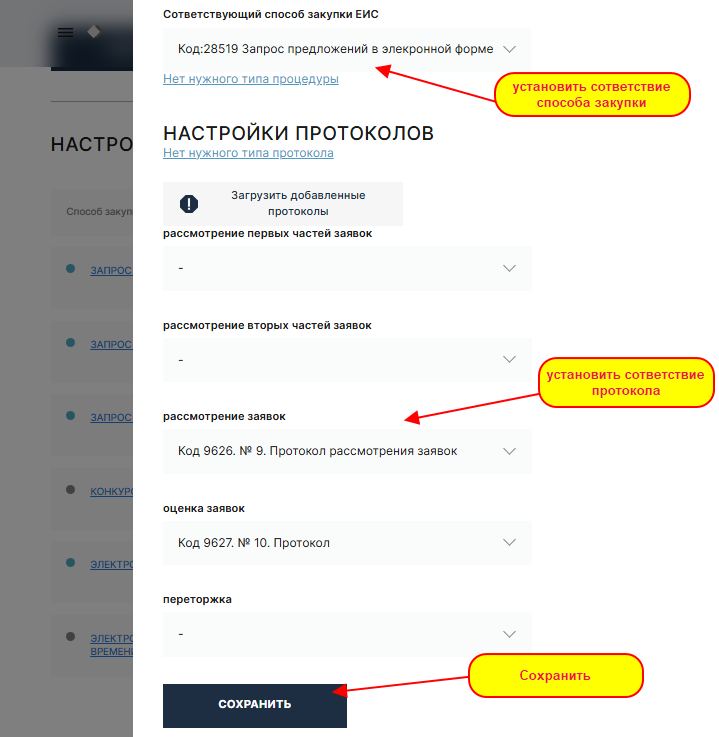 - Каждому способу размещения торговой процедуры на торговой площадке поставьте в соответствие способ, зарегистрированный Вами на