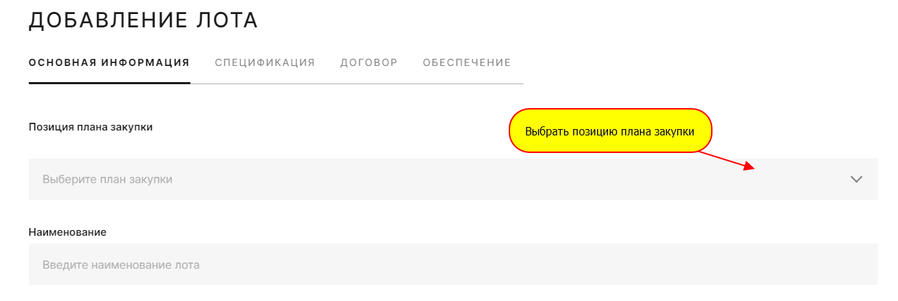 - При добавлении нового лота нужно выбрать позицию из загруженного  плана закупок :