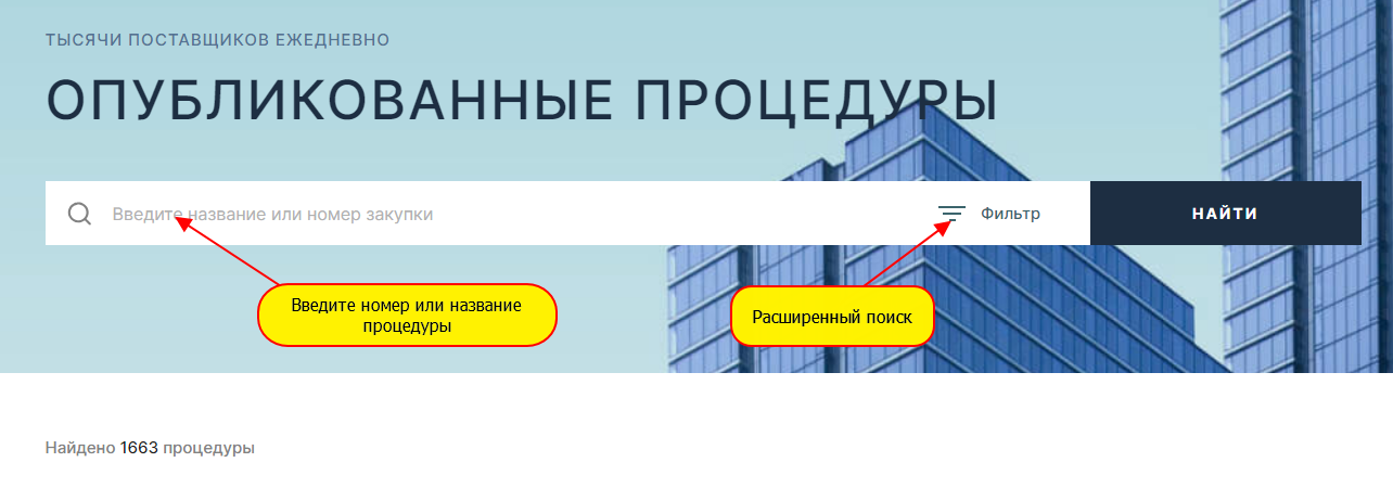 На ЭТП предусмотрен поиск процедур. На главной странице в поле «Поиск процедур» необходимо ввести номер процедуры или название процедуры, затем нажать «Найти».