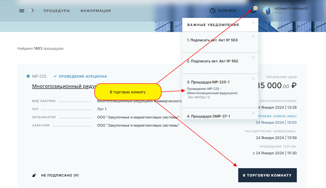 Допущенный к участию в процедуре пользователь в личном кабинете увидит уведомления о статусе процедуры «Проведения аукциона» и   приглашение пройти в торговую комнату. Нажав на одну из этих надписей пользователь попадает в форму пункта меню «Участие в торгах».