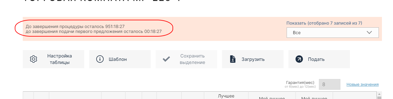Участник процедуры может контролировать время до завершения этапа торгов в строке, расположенной над таблицей спецификации.