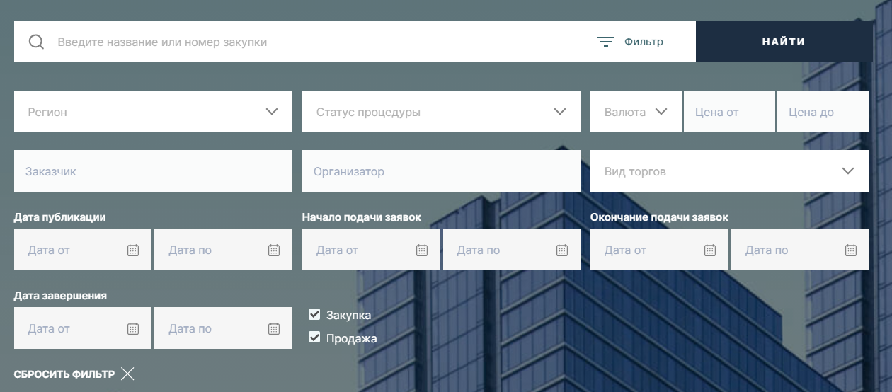 На ЭТП предусмотрен поиск процедур по нескольким признакам. Для этого необходимо нажать на «Расширенный поиск».  Заполнить необходимые критерии и признаки искомых процедур. Нажать на кнопку «Найти».