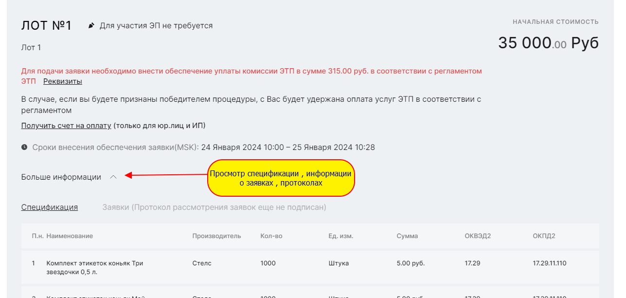 В окне закупки можно ознакомится со спецификацией процедуры. Для этого необходимо нажать на «Больше информации», под наименованием лота.