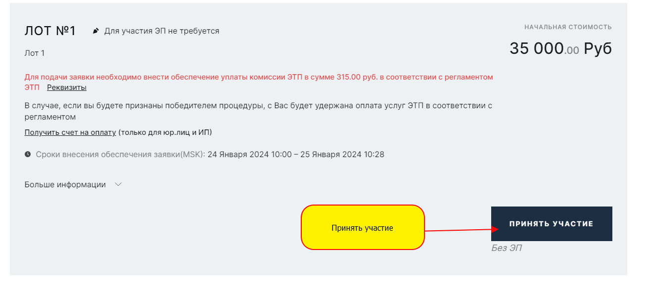 Для подачи заявки на участие в процедуре необходимо в окне процедуры нажать на «Принять участие».