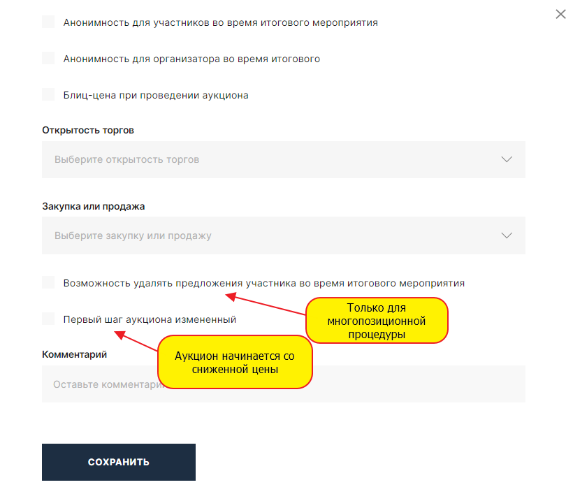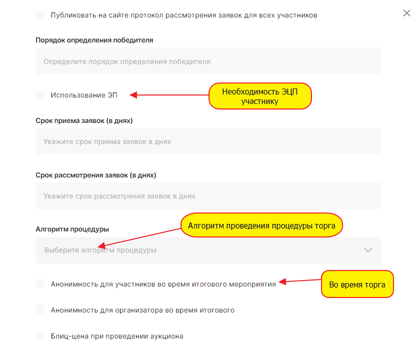 - создание комиссии для принятия решения по каждому этапу процедуры закупки/продажи.