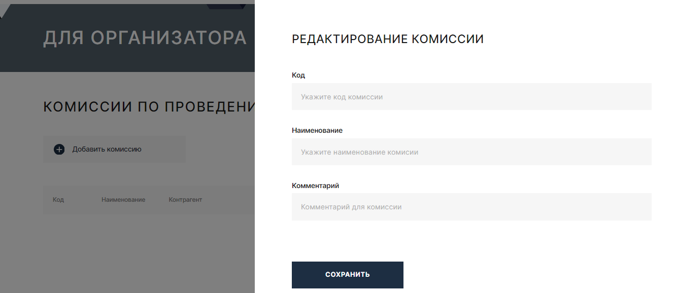 1).    в пункте меню выбрать «Организатору», затем «Комиссии». В открывшемся окне выбрать «Добавить комиссию». В открывшейся форме заполнить обязательные поля. После заполнения полей нажать кнопку «Сохранить».