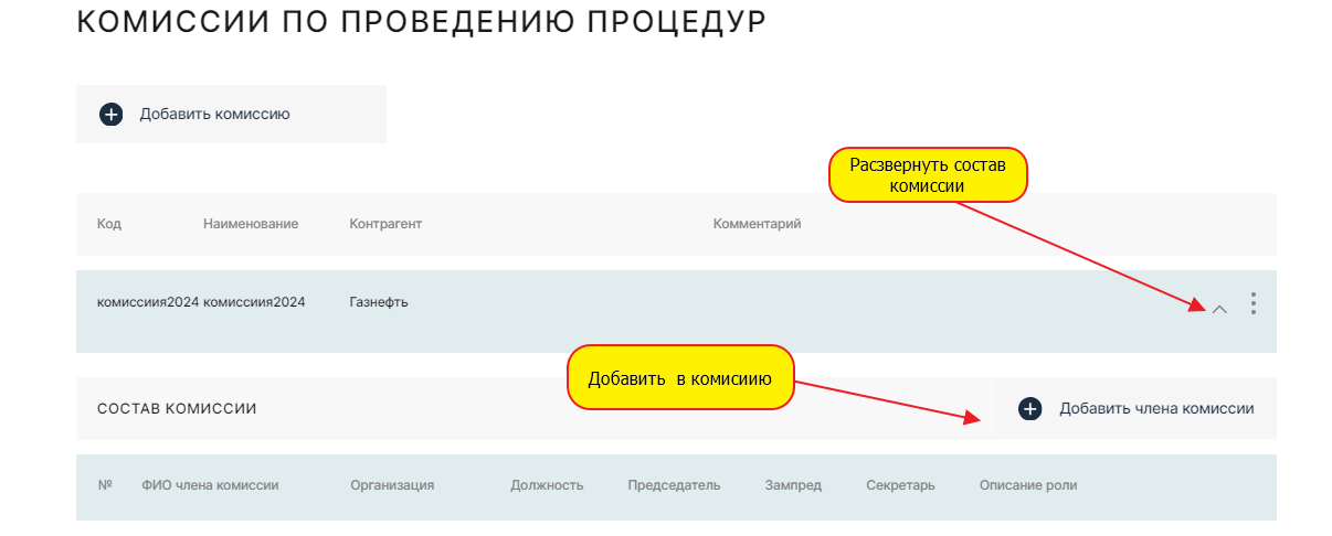 2).         В добавленной строке кнопкой разверните содержимое комиссии , нажмите кнопку «Добавить члена комиссии» :